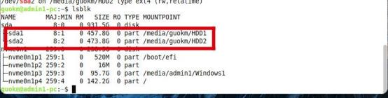 输入 sudo mount /dev/sda1 /media/guokm/HDD1 sudo mount /dev/sda2 /media/guokm/HDD2